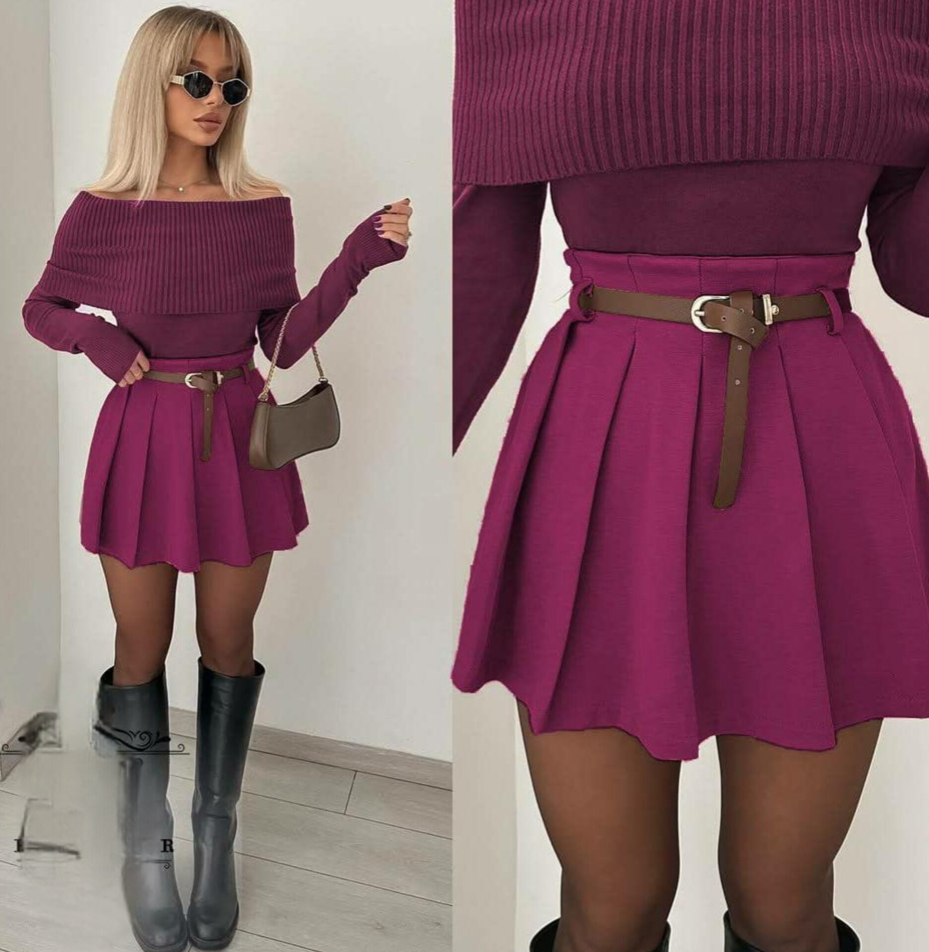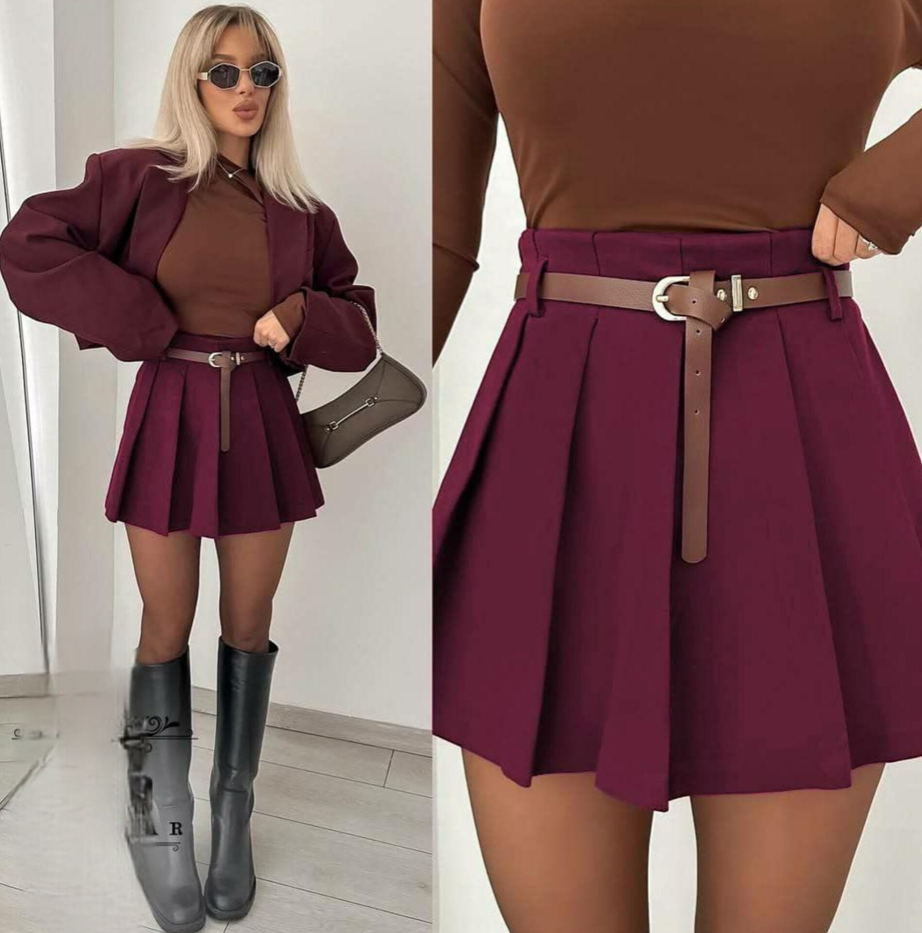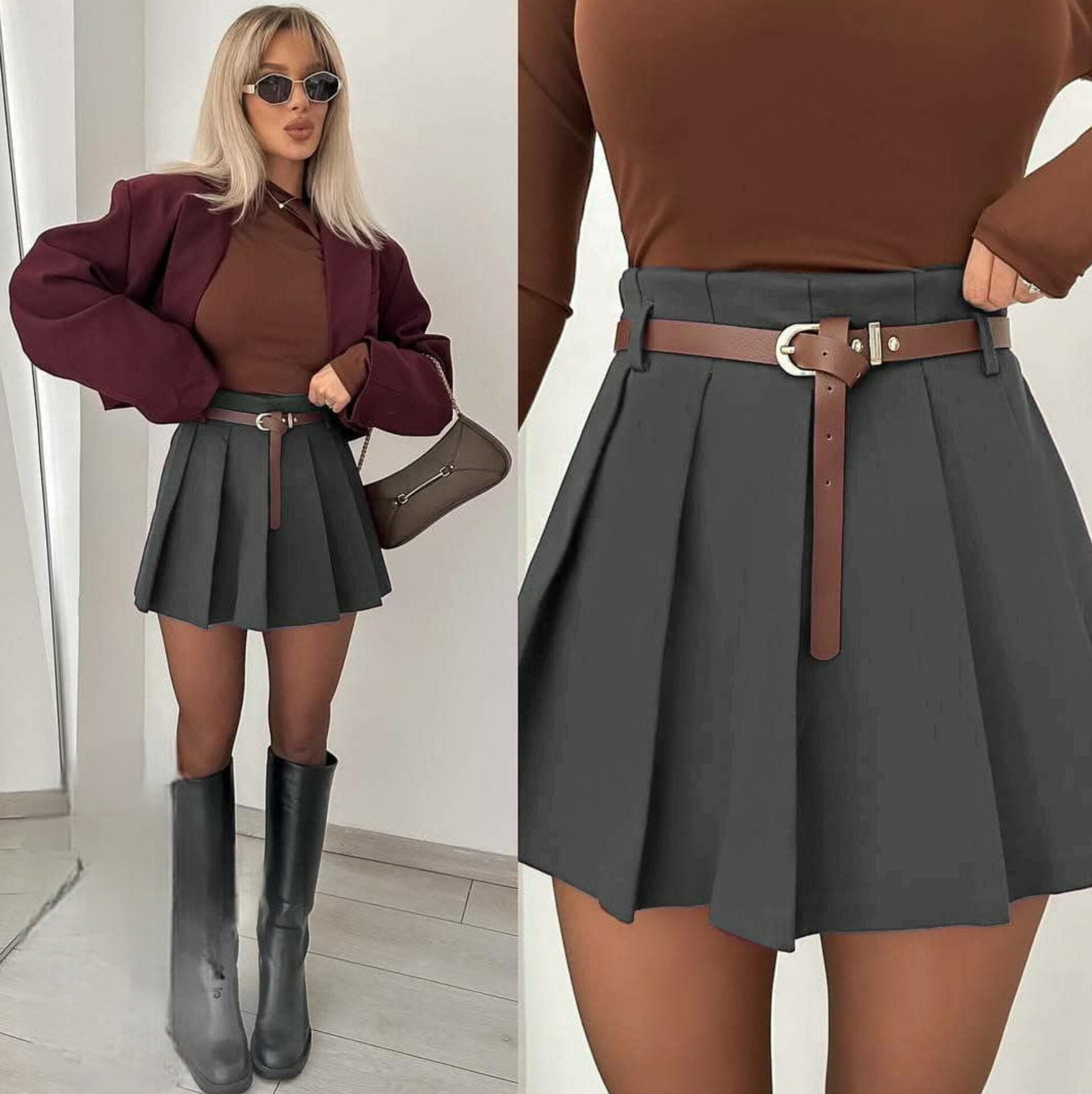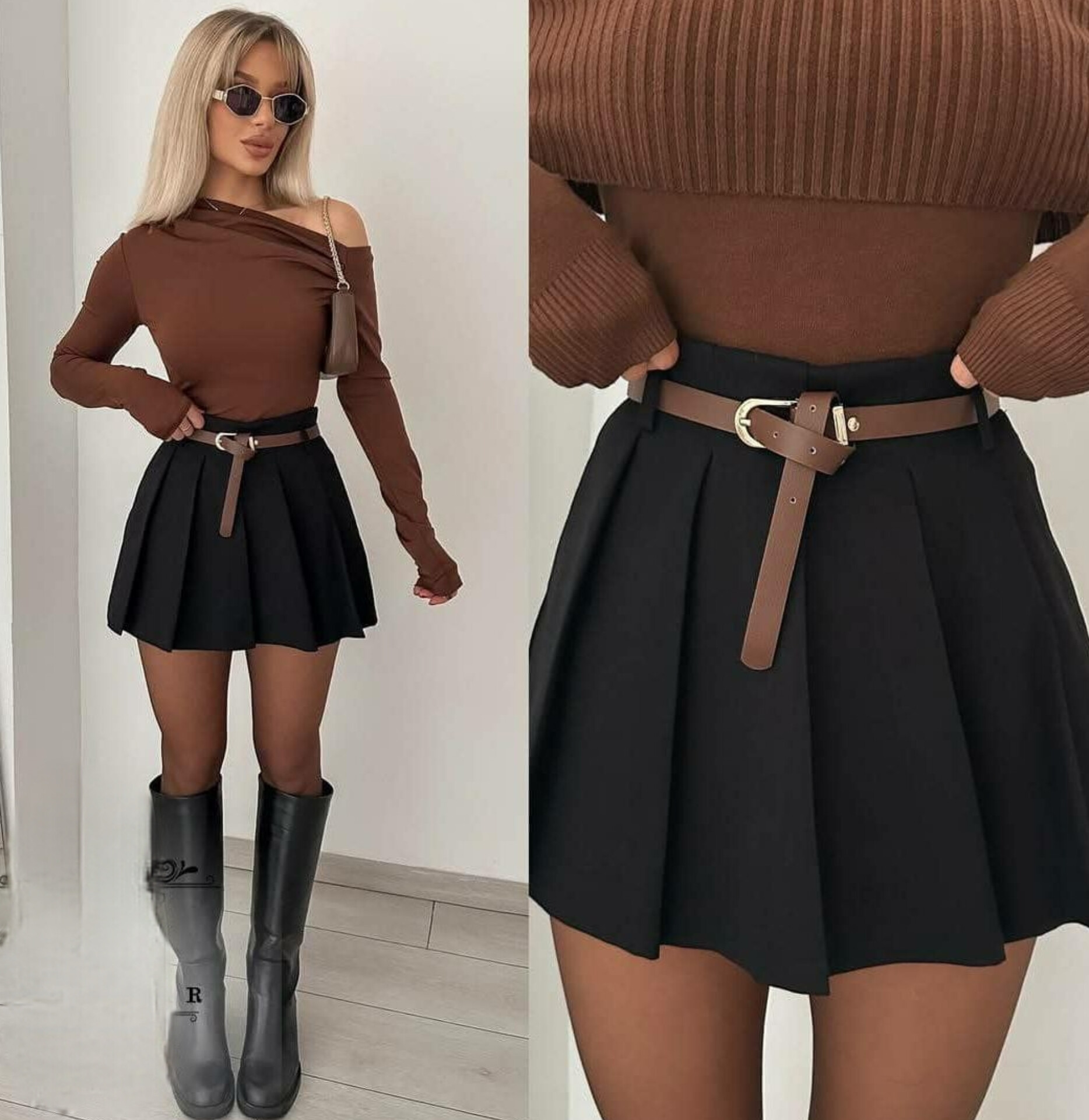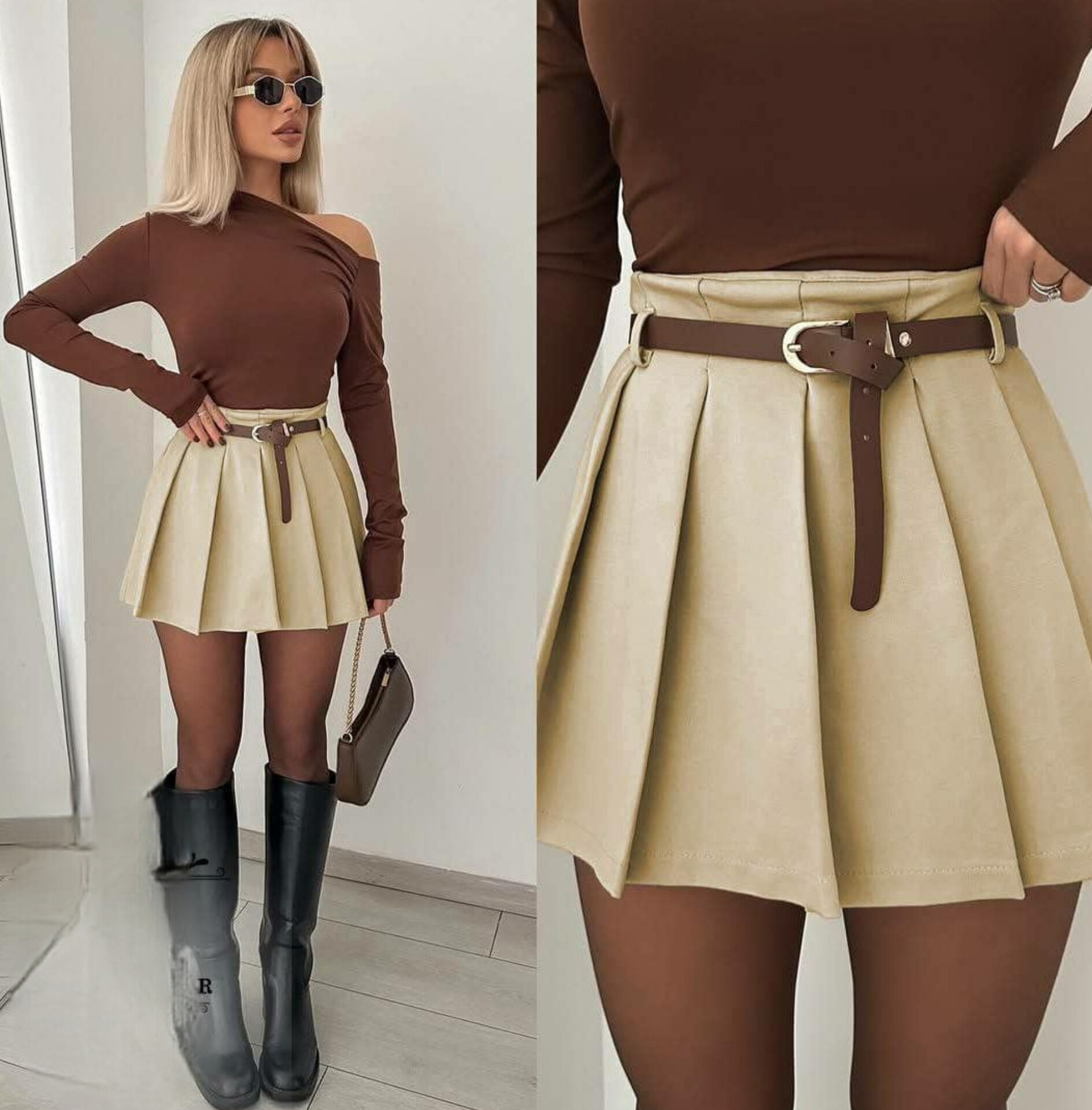 – بلوز با پارچهٔ لطیف (مثلاً ابریشوار یا نخنخی با بافت ساده) و دامن مودی یا میدی تکرنگ در رنگ خنثی.